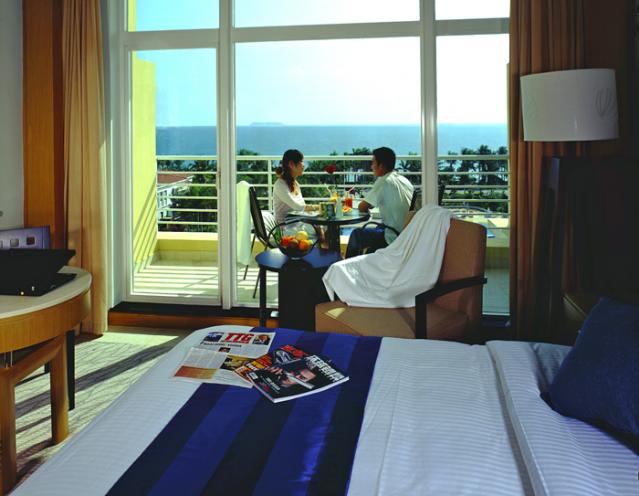 180度豪華海景房,面積48平方米,樓層5-7層,有陽臺,180度海景,大床(1.8*2米),雙床(1.2*2米),有浴缸,免費(fèi)寬帶